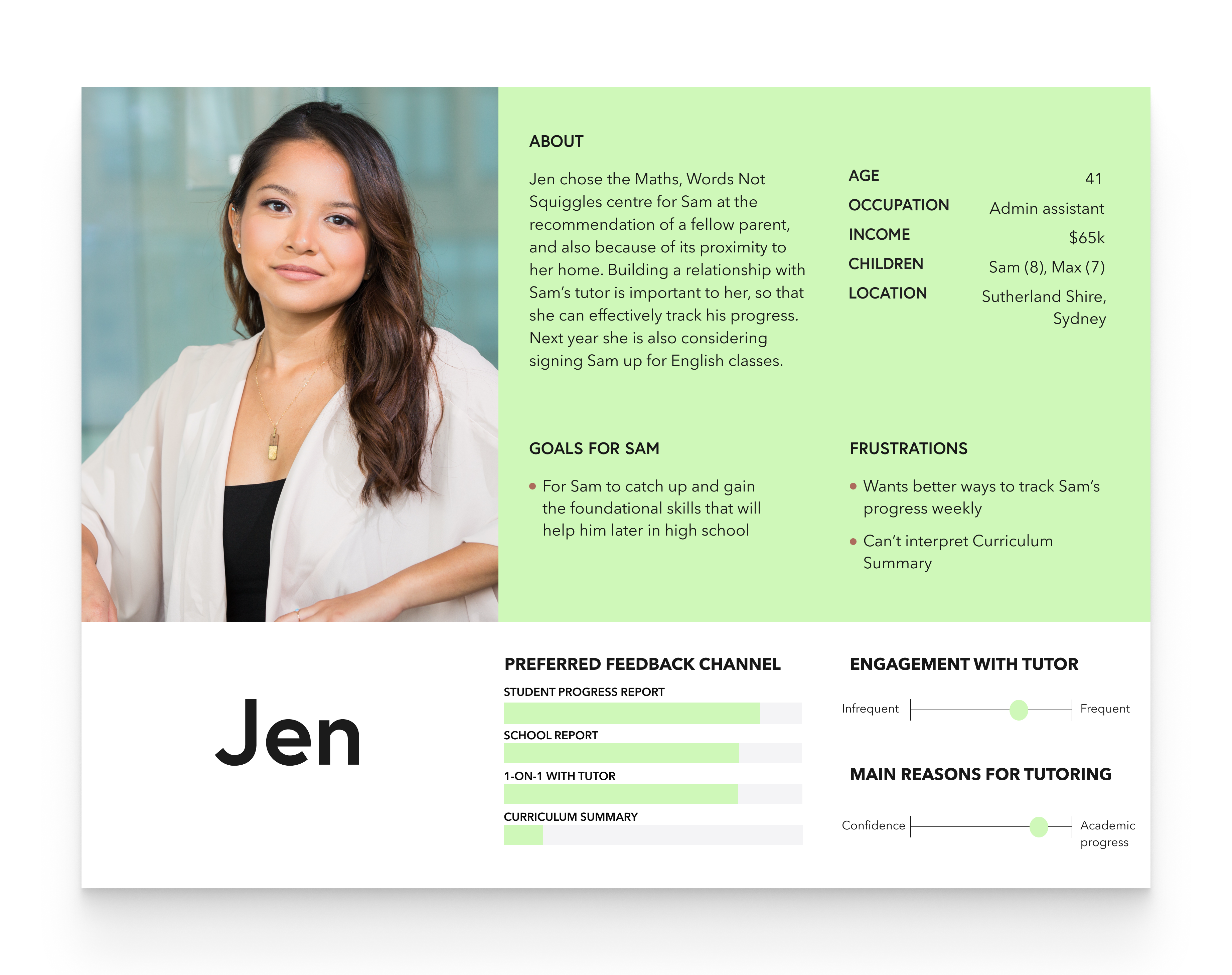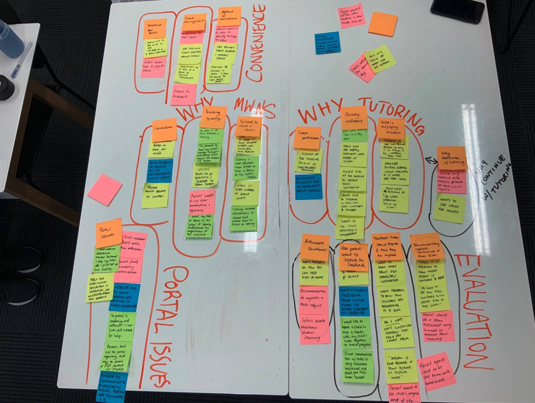 We started the project by delving deeper into understanding the parents of school-aged children, and what their key goals and motivations might be when signing their kids up for a tutoring service. We spoke to 4 parents who use Maths, Words Not Squiggles, as well as three parents who were not currently using after-school tutoring but may consider it in the future. We pooled our research with fellow UX designers across 12 parent conversations in order to synthesise our findings.