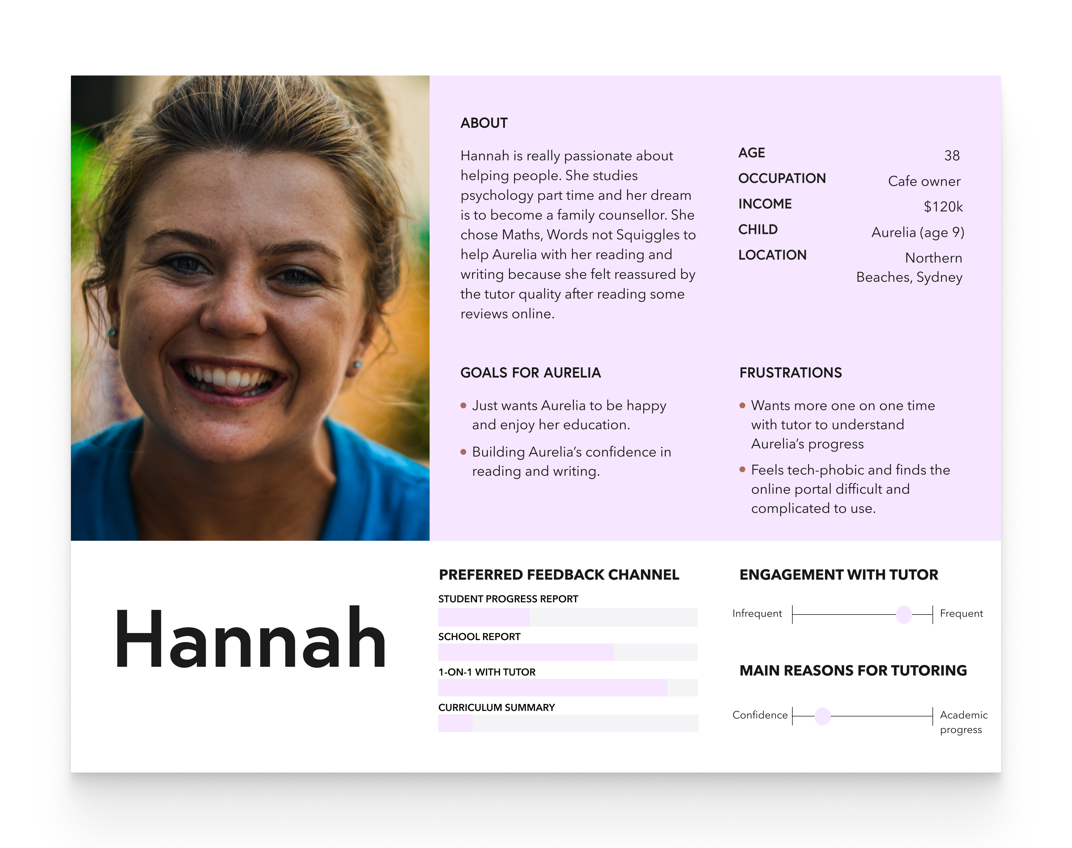 Through the research and identifying the key pain points of parents using the tutoring service, we developed two key user personas. Hannah (persona 1) just wants her daughter Aurelia to feel more confident in her schoolwork. She really values talking to her tutor after the class and wishes there were more opportunities to do this.